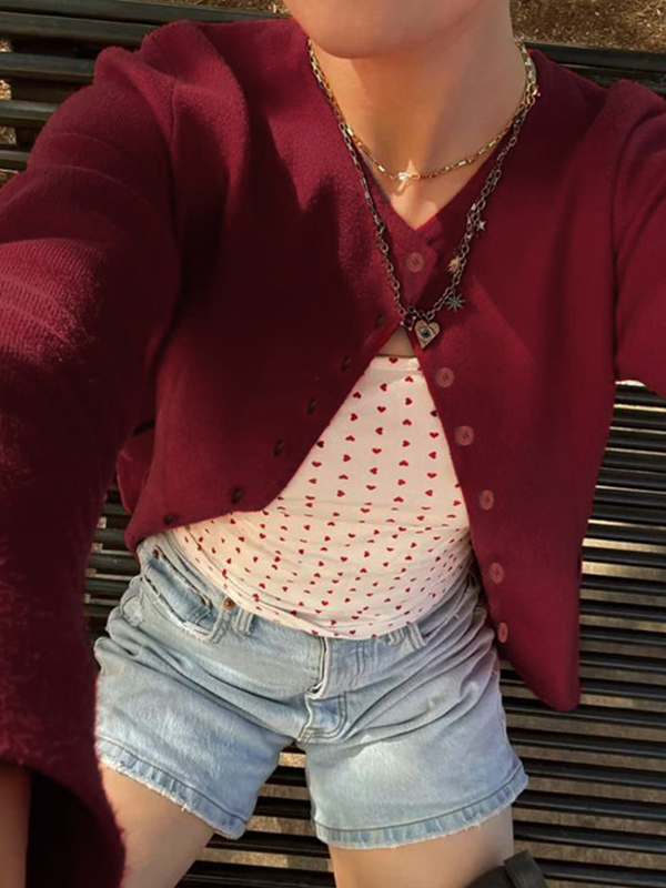 Contrast Color Scallop Trim Puff Sleeve Cardigan