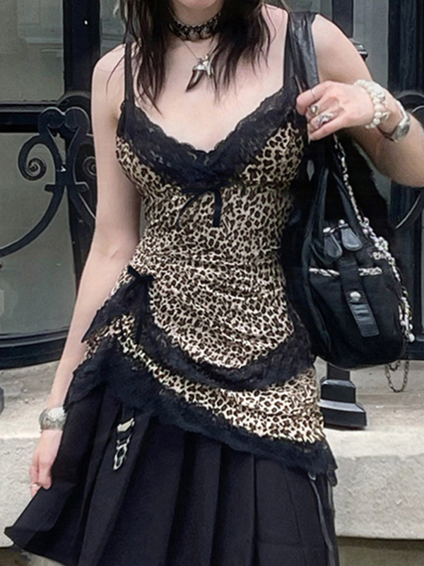 Lace Leopard Print Fake Two Piece Long Sleeves Tee
