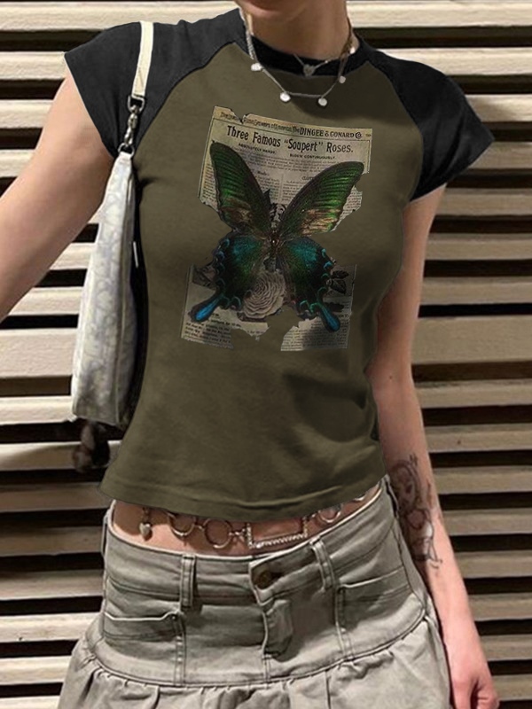 Vintage Butterfly Print Raglan Short Sleeve Tee