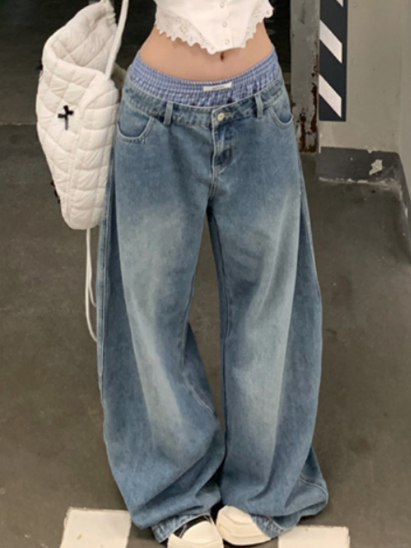 Designed Double Waistband Washed Wide Legs Boyfriend Jeans